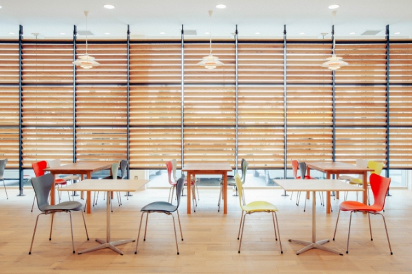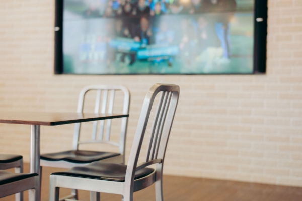 散居村や木彫りの町のイメージを表現するため、木の質感を肌で感じられるような落ち着きのある店内に仕上げられた砺波店。幅広い年齢層のお客様が訪れやすいインテリアを採用し、色とりどりのセブンチェアがお客様をお迎えいたします。