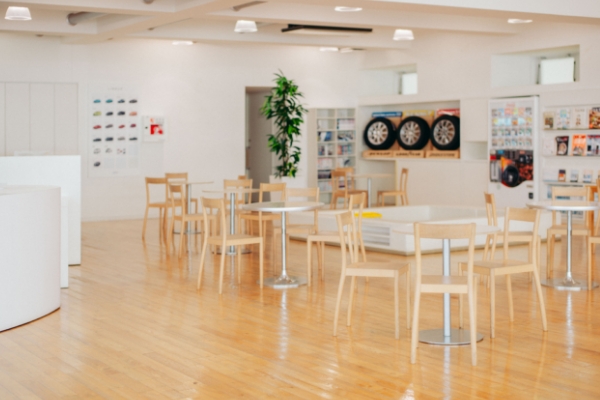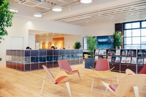 「旧本社の面影を、どこかに残したい」との想いから本社の建替を行う際に全面リノベーションを行い、誕生。古びた雰囲気を残しつつ、温かみのある天然木を用いて趣のある空間を演出。リラックスしてU-Car選びが出来る環境を整えました。